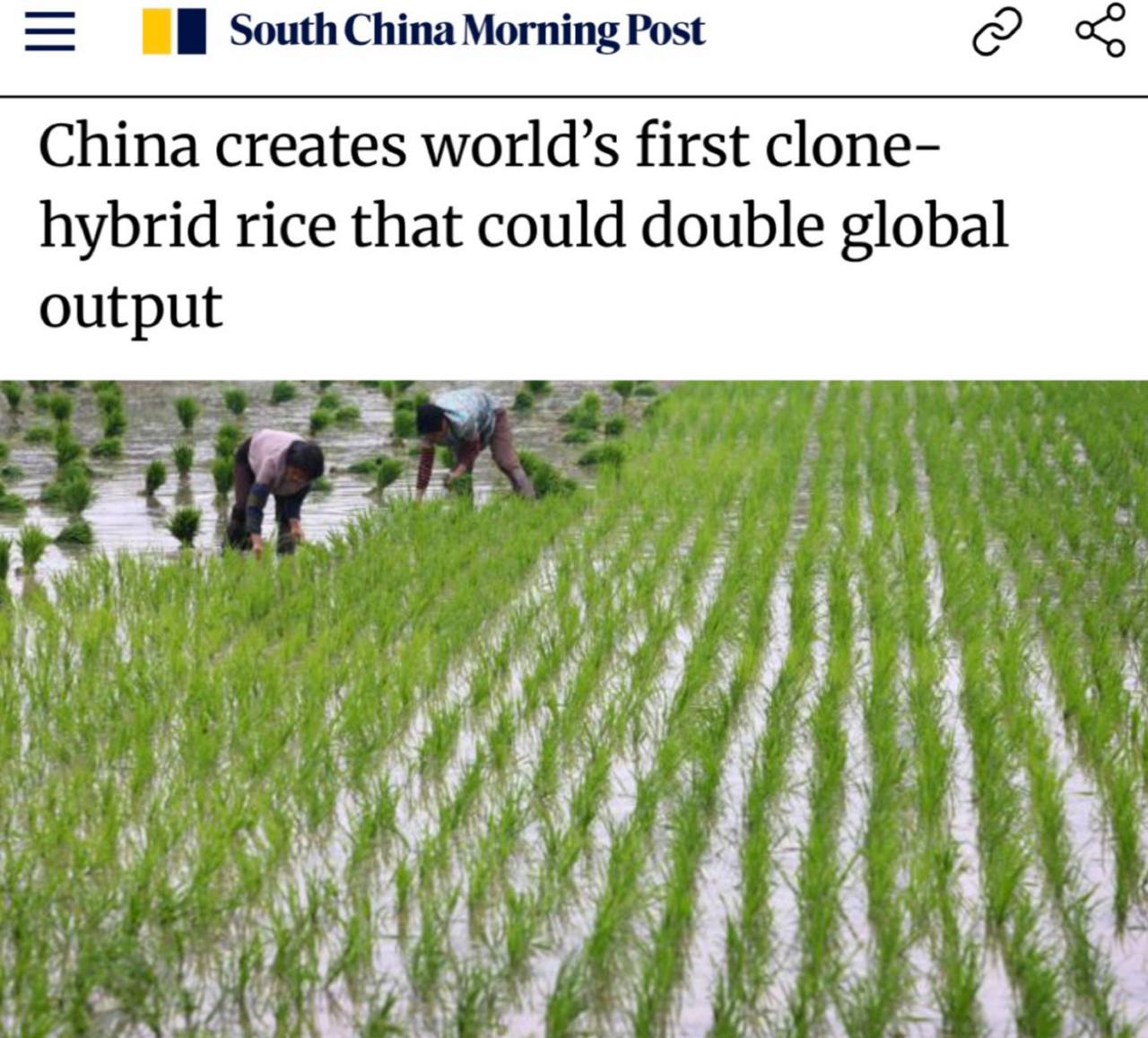«Китайские исследователи разработали новую форму гибридного риса, способного самовоспроизводиться с помощью клонированных семян, точно сохраняя высокоурожайные характеристики из поколения в поколение. Разработка устраняет самый большой барьер на пути к широкому выращиванию высокоурожайного гибридного риса - необходимость покупать дорогие новые гибридные семена каждый сезон.