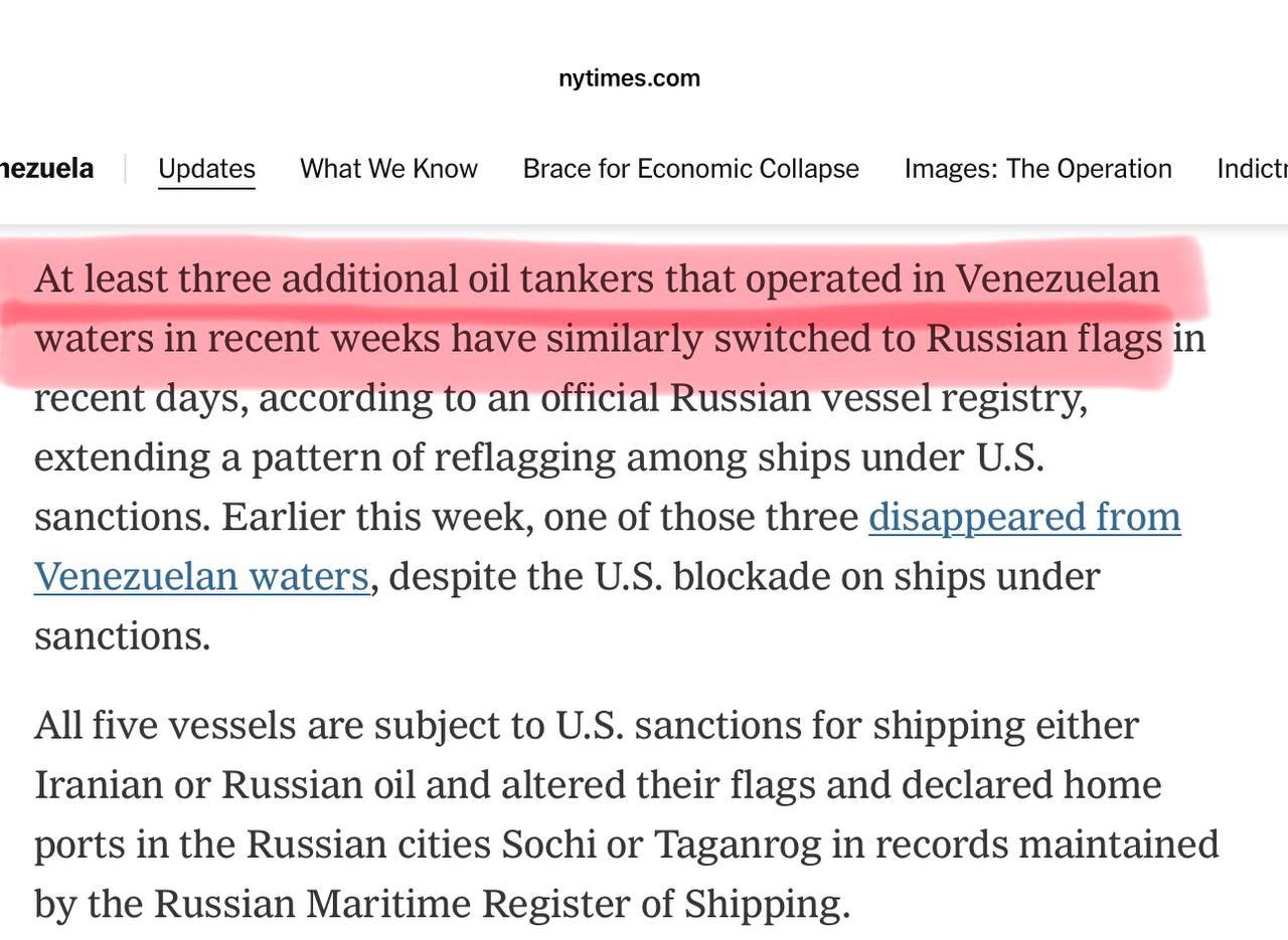 Как минимум ещё три танкера, которые в последние недели работали в водах Венесуэлы, за последние дни перешли под российский флаг и сменили порты приписки на российские города Сочи или Таганрог, — о данных официального российского судового реестра пишет New York Times.
