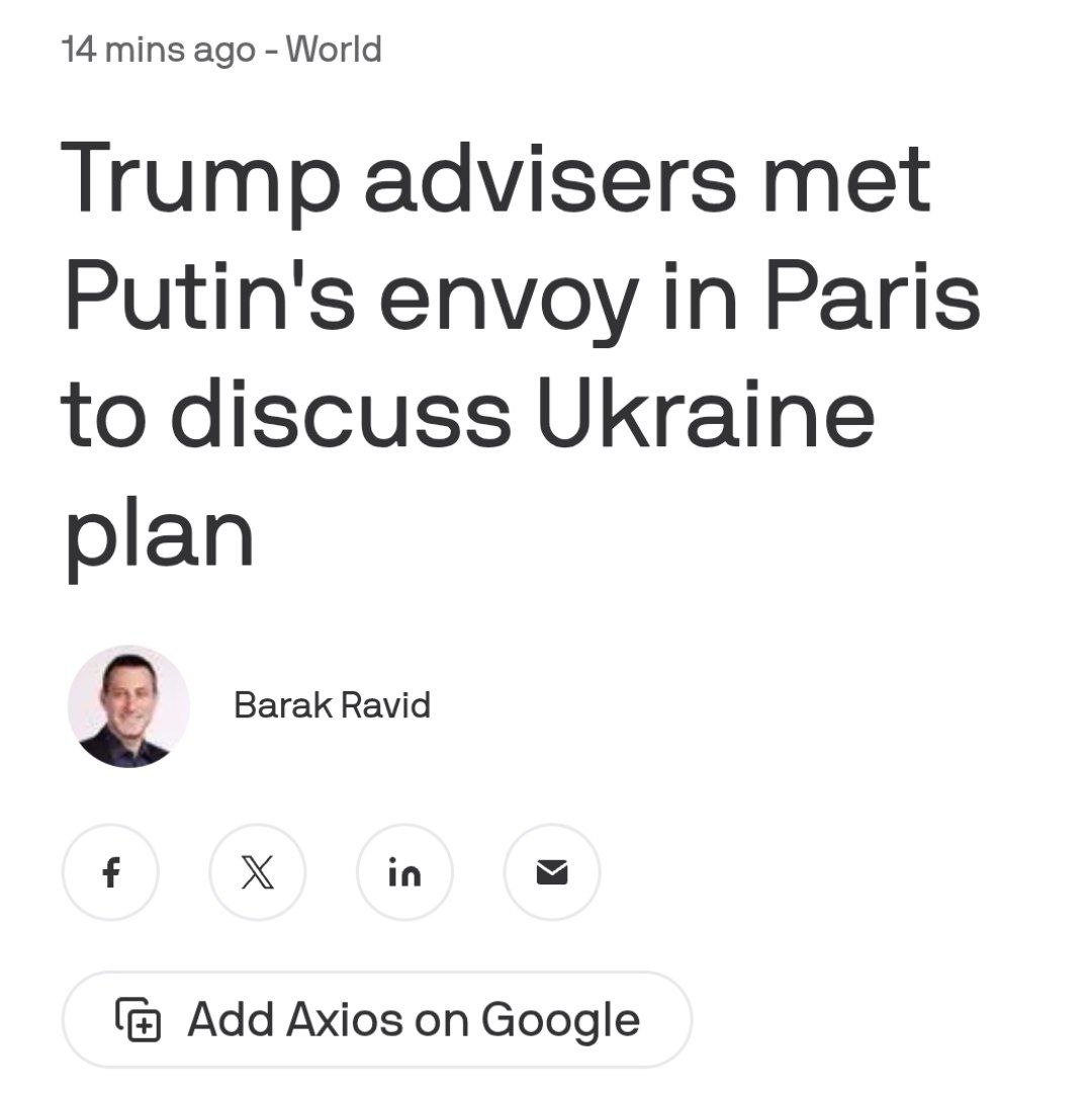 AXIOS: Стив Уиткофф и Джаред Кушнер встретились в Париже с российским посланником Кириллом Дмитриевым, чтобы обсудить мирный план США для Украины.
