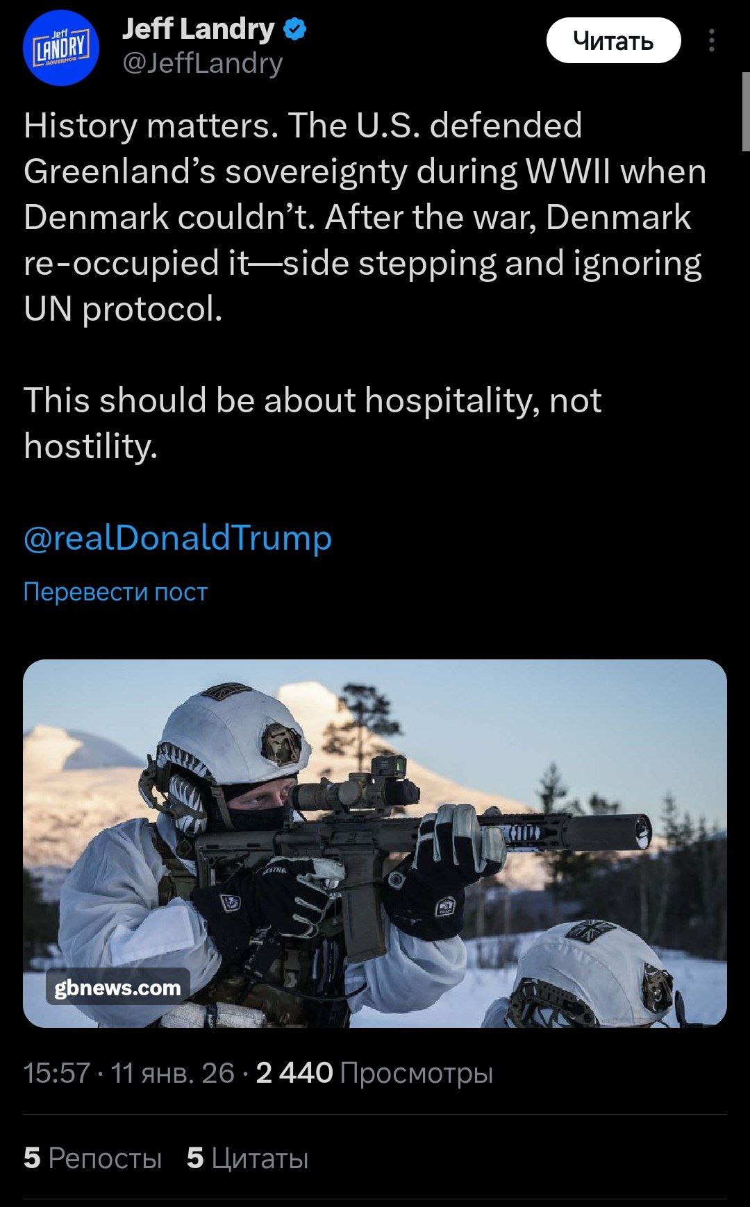 «Дания вновь оккупировала Гренландию, проигнорировав протокол ООН», — заявил спецпосланник США Джефф Лэндри.