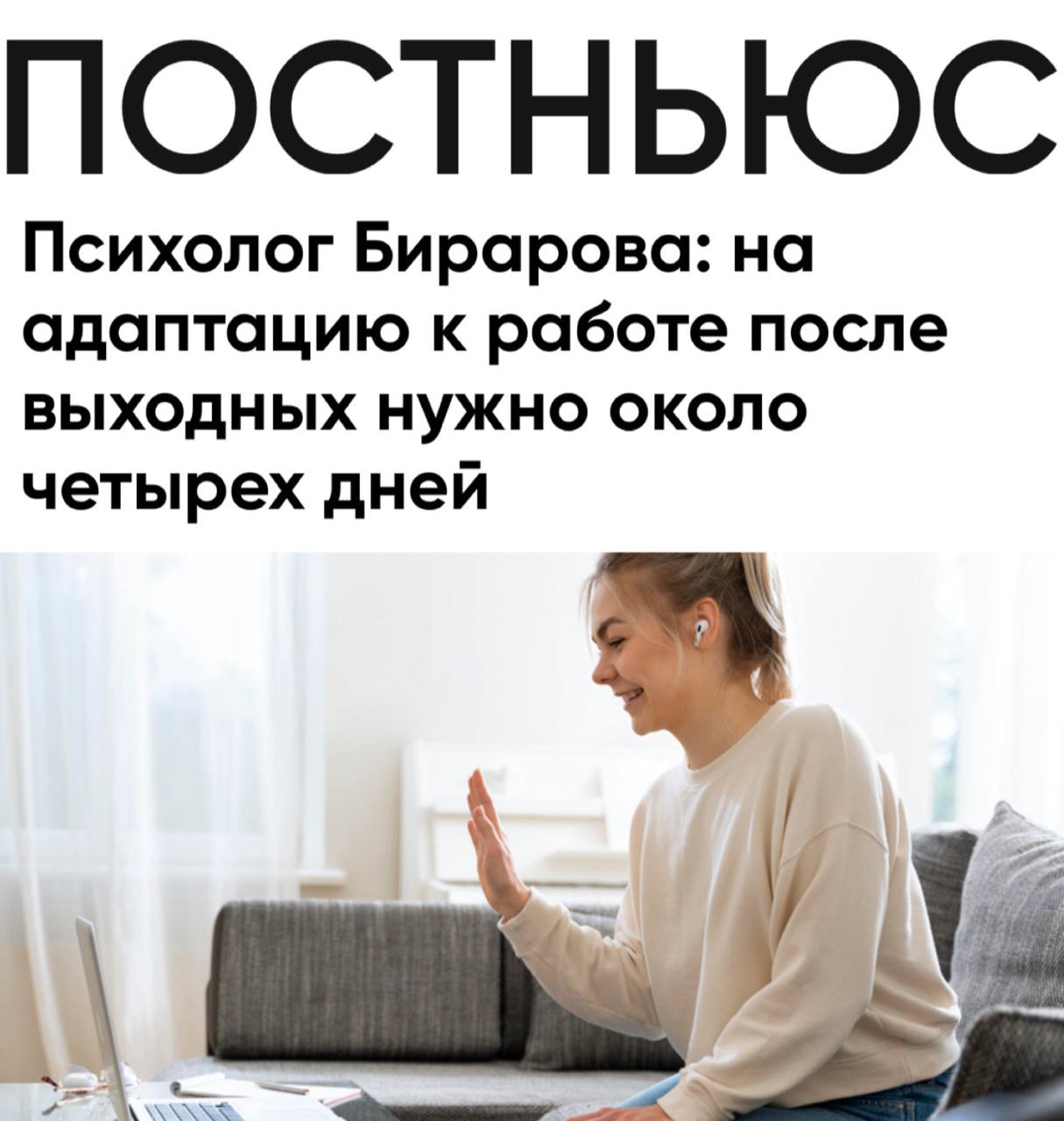 «Психолог Наиля Бирарова рассказала, что на адаптацию к работе после выходных нужно около трех-четырех дней. Работать в этот период можно в замедленном темпе. По словам эксперта, за это время психика перестраивается с режима отдыха на рабочий формат и приходит в тонус. Однако биоритмы всех людей работают индивидуально.