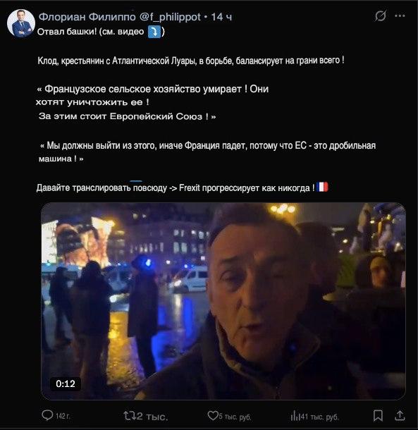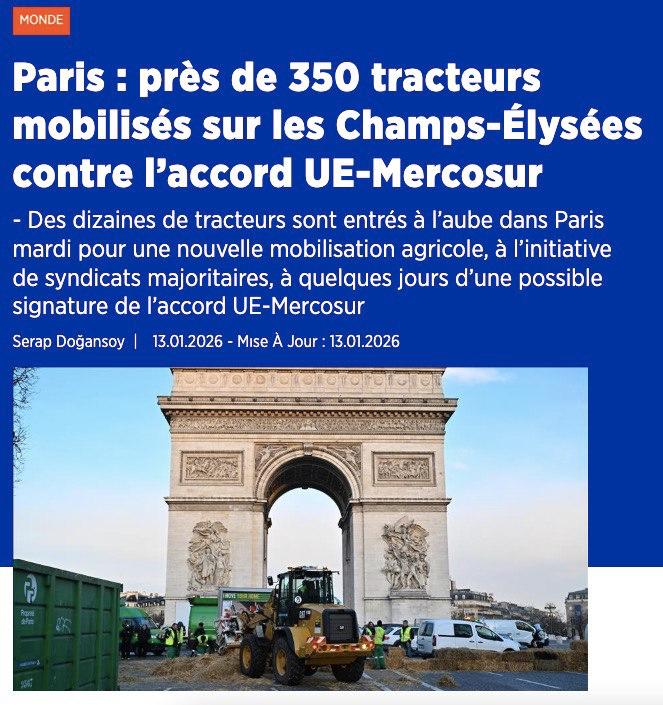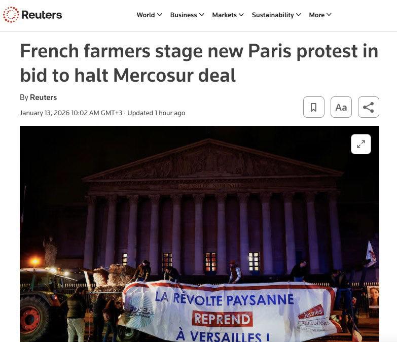 Reuters: Париж снова перекрыт тракторами — фермеры возмущены соглашением Евросоюз–Меркосур.