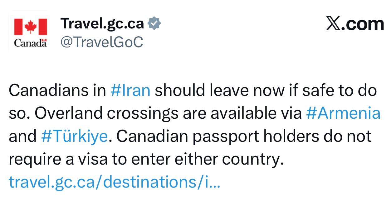 Канадцам, находящимся в Иране следует покинуть страну сейчас. Это можно сделать через Армению и Турцию. Владельцам канадских паспортов виза для въезда в обе страны не требуется.