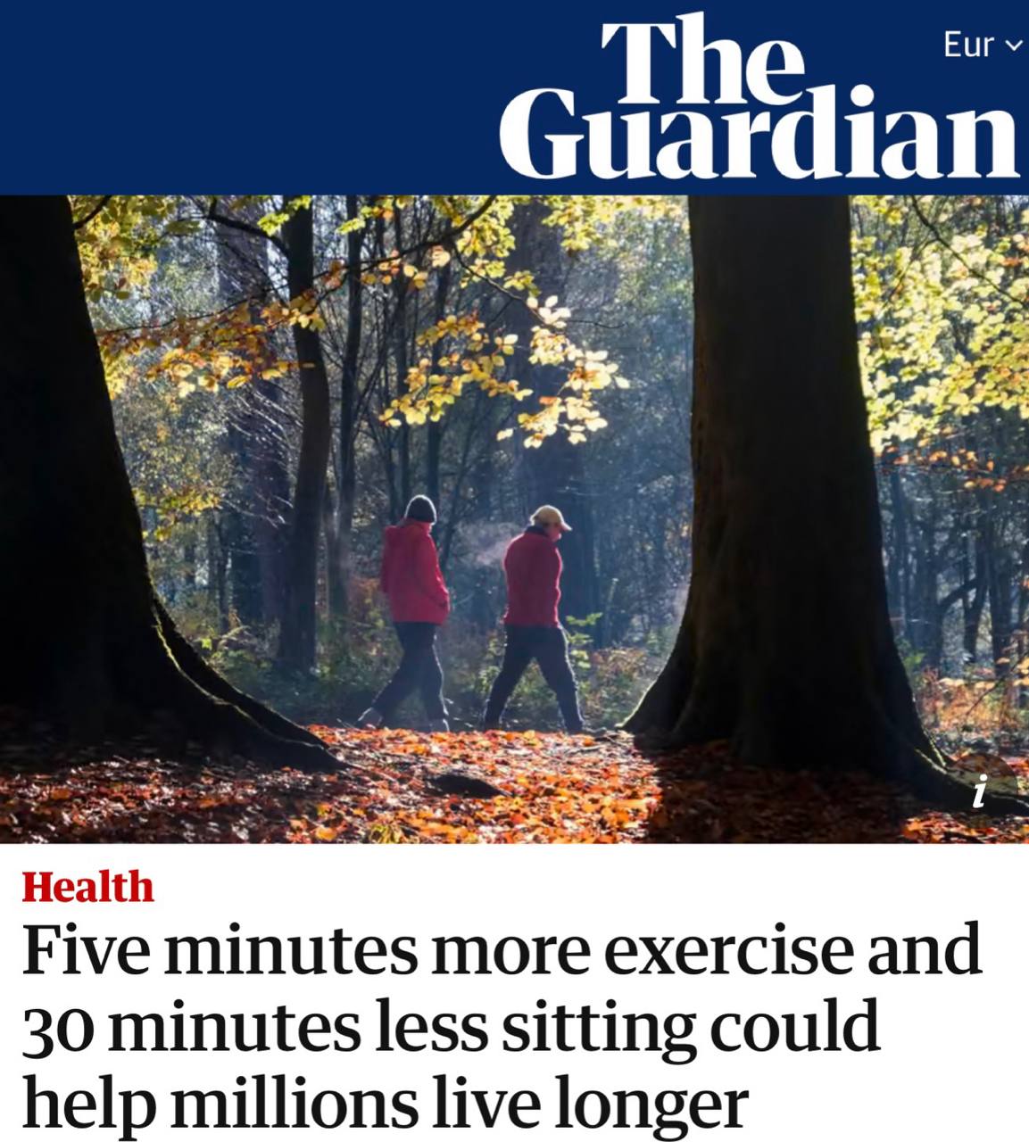 «Увеличение физической активности на пять минут и сокращение времени в сидячем положении на полчаса ежедневно могут помочь миллионам людей жить дольше. К таким выводам пришли исследователи. Дополнительные пять минут умеренной физической активности, к примеру, быстрой ходьбы, в день снижает смертность на 10%.