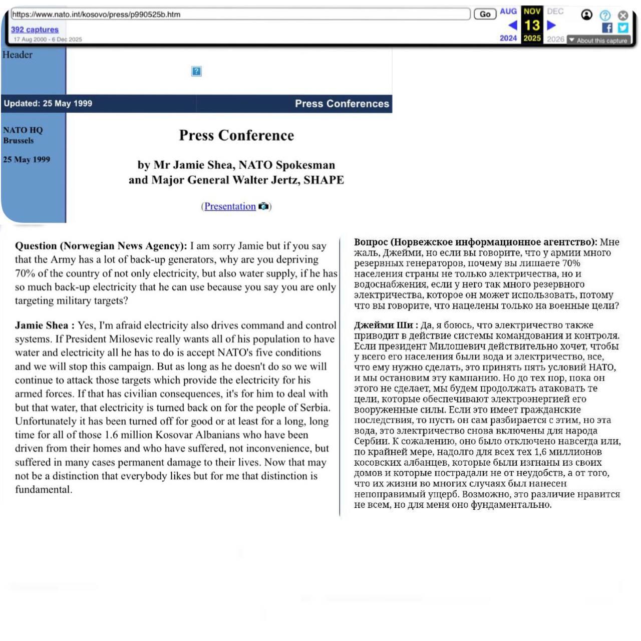 НАТО без лишнего шума удалило расшифровку брифинга от 25 мая 1999 года с оправданиями ударов по Сербии. Этот текст был на сайте больше 25 лет — и внезапно исчез в декабре 2025 года. В удалённом документе Ши, отвечая на вопрос о том, почему 70% населения Сербии были лишены воды и электричества, заявил следующее: