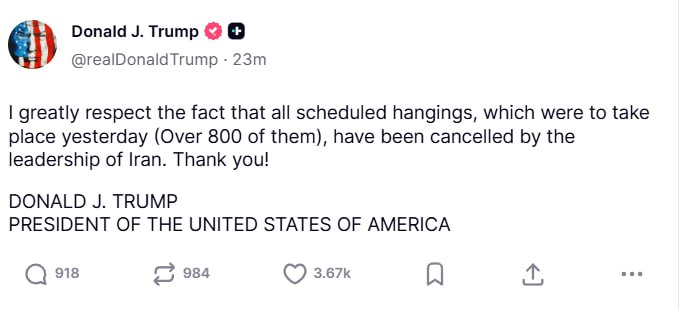 «Я с большим уважением отношусь к тому факту, что все запланированные казни, которые должны были состояться вчера (более 800 из них), были отменены руководством Ирана. Спасибо!».