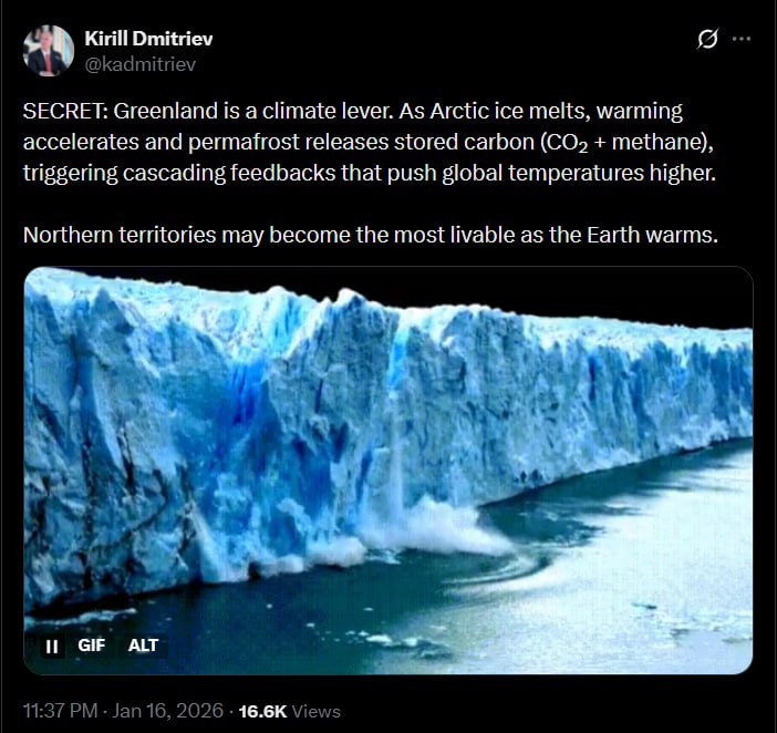«СЕКРЕТ: Гренландия — это климатический рычаг. По мере таяния арктического льда потепление ускоряется, а вечная мерзлота высвобождает накопленный углерод (CO + метан), запуская каскадную обратную связь, которая ведет к дальнейшему росту глобальных температур.