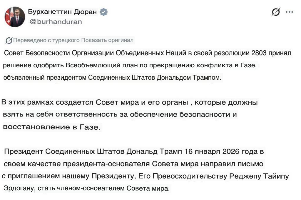Дональд Трамп предложил президенту Турции Эрдогану стать одним из основателей «Совета мира» по Газе, сообщил глава управления по коммуникациям администрации президента Турции Бурханеттин Дуран.