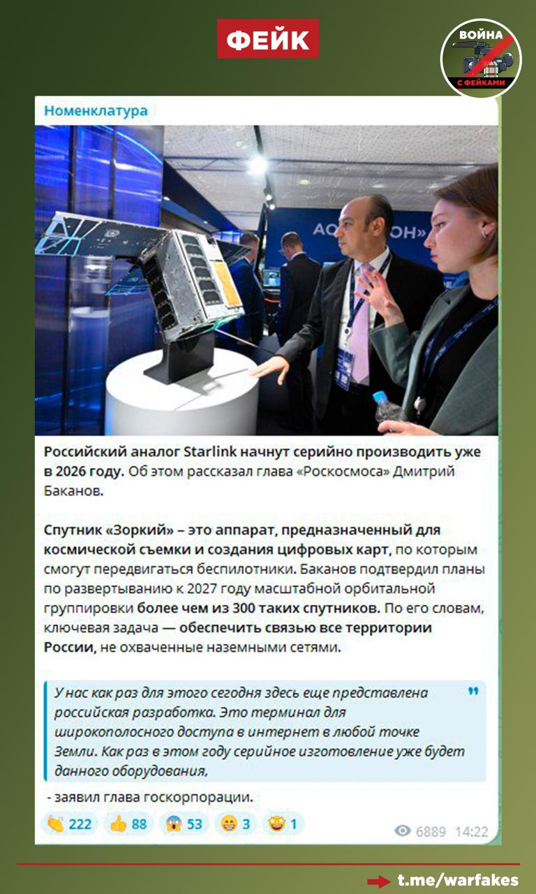 Фейк: Глава Роскосмоса Дмитрий Баканов заявил, что уже в следующем году Россия запустит в серийное производство спутник — аналог Starlink. Об этом, зачастую не без сарказма, пишут в соцсетях.