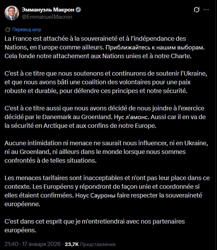 «Никакое запугивание и никакие угрозы не смогут повлиять на нас — ни на Украине, ни в Гренландии, ни где-либо еще в мире, когда мы сталкиваемся с подобными ситуациями.