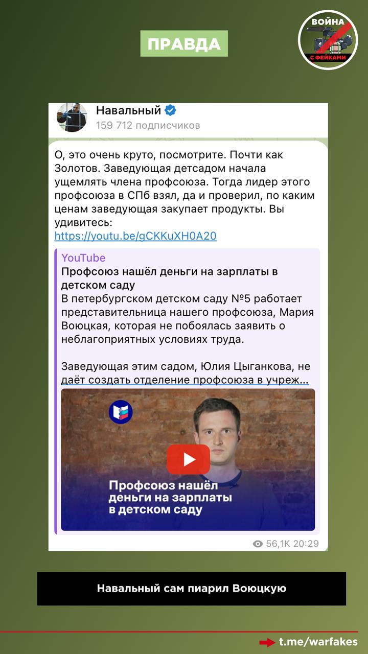 Тесную связь Воюцкой с оппозицией подтверждает ее медийное присутствие на хорошо знакомых нам площадках-фейкоделах. Например, в телеграм-канале «Сота» (иноагент).