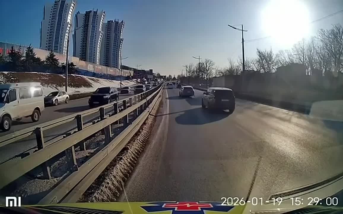Машина с включенными спецсигналами и сиреной везла девушку, пострадавшую во время катания на лыжах, она получила перелом позвоночника со смещением. На дороге им попался "учитель", который решил их притормозить.