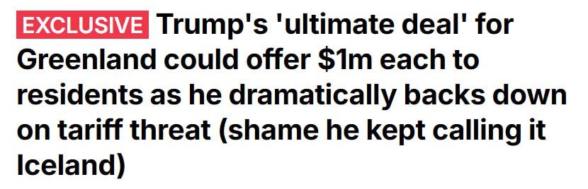 Издание со ссылкой на источники сообщает, что администрация президента Дональда Трампа рассматривает возможность предложить каждому из 57 тысяч жителей Гренландии по одному миллиону долларов в случае, если они проголосуют за присоединение к Соединённым Штатам.