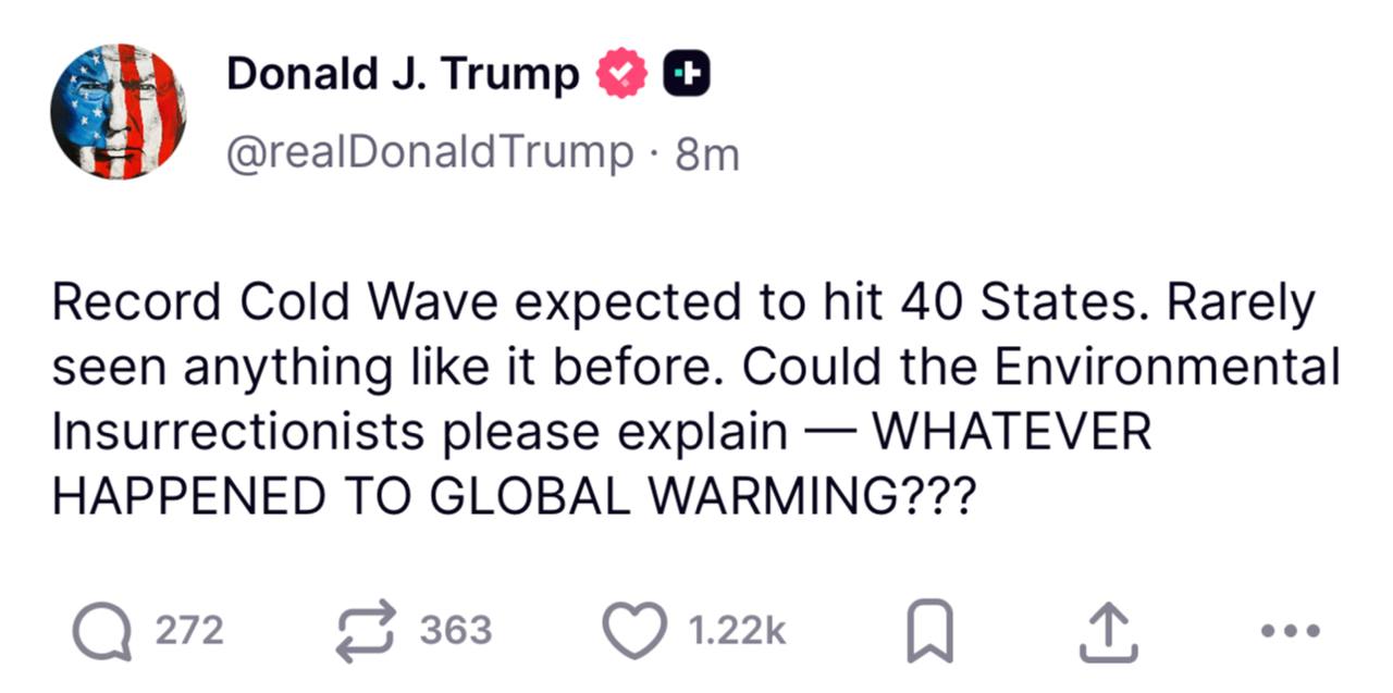 Ожидается рекордная волна холода, которая накроет 40 штатов. Нечто подобное случается крайне редко. Не могли бы экологические мятежники объяснить — что же случилось с глобальным потеплением?