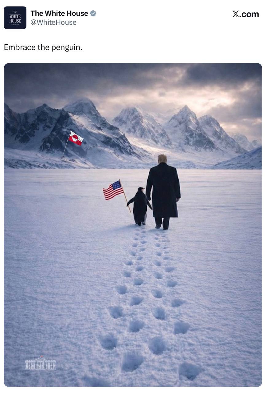 Белый дом опубликовал противоречивое фото из Гренландии. Только вот изображенный на нём Трамп живёт в США, а пингвин - в южном полушарии.