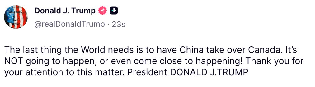 «Последнее, что нужно миру, — это чтобы Китай взял под контроль Канаду. Этого не произойдёт и даже близко не произойдёт! Благодарю за внимание к этому вопросу».