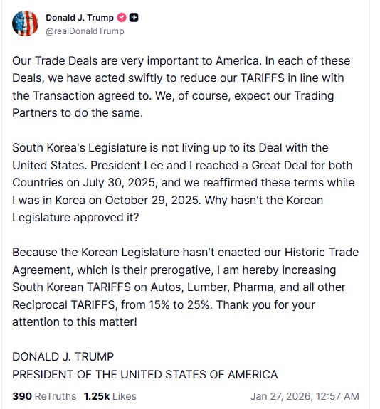 Поскольку корейский законодательный орган не ввел в действие наше Историческое торговое соглашение — что является их прерогативой — настоящим я повышаю пошлины для Южной Кореи на автомобили, пиломатериалы, фармацевтику и все остальные взаимные ПОШЛИНЫ с 15% до 25%. Благодарю за внимание к этому вопросу!»