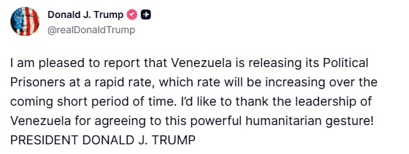 Трамп заявил, что Венесуэла «освобождает своих политических заключенных быстрыми темпами».