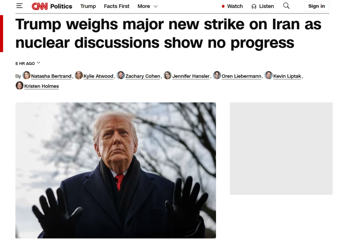 «Президент Дональд Трамп рассматривает возможность нанесения нового крупного удара по Ирану после того, как предварительные переговоры между Вашингтоном и Тегераном об ограничении ядерной программы страны и производства баллистических ракет не принесли результатов», — сообщают источники, знакомые с ситуацией.