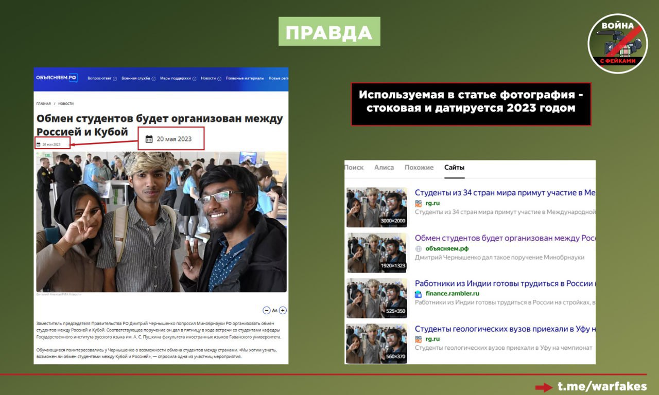3. Использование архивных фотографий. Изображение, сопровождающее фейк, было взято из статьи 2023 года и не имеет отношения к заявленной теме.
