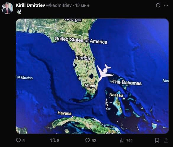 Спецпредставитель президента, глава РФПИ Кирилл Дмитриев сегодня будет находиться в Майами. Об этом он сообщил, опубликовав фото карты с изображением самолета у побережья Флориды.