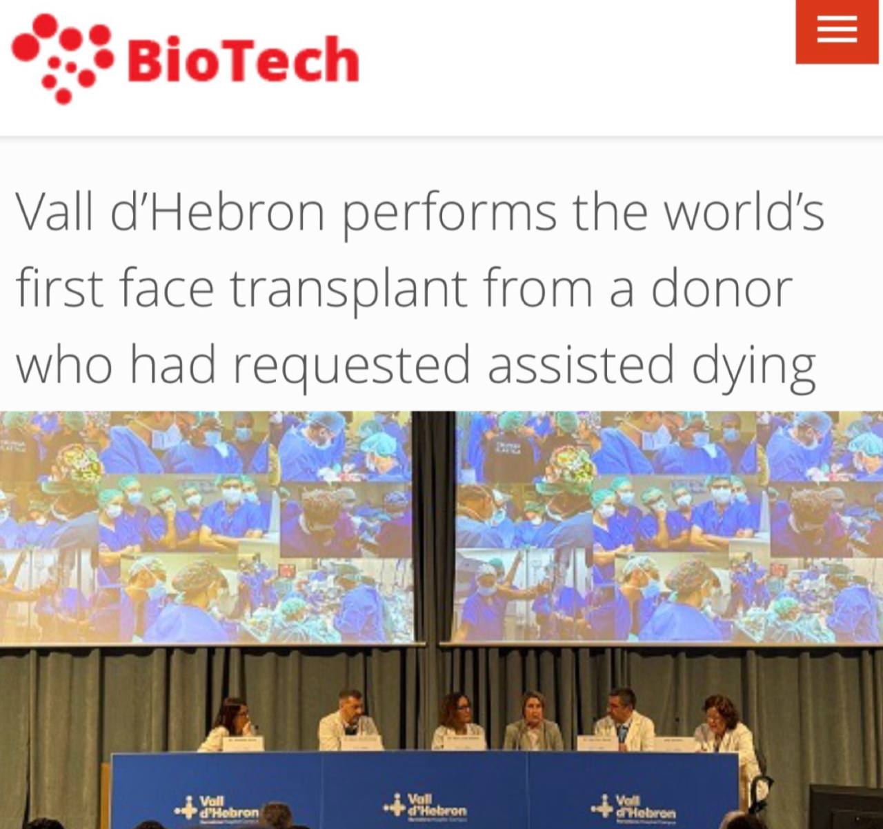 «Vall d'Hebron осуществила первую в мире частичную трансплантацию лица от донора, которому была проведена эвтаназия. Донору было разрешено получить эвтаназию, и он не только согласился на донорство органов и тканей, но и предложил пожертвовать лицо. Так, пациентке потребовалась трансплантация центральной части лица после некроза тканей, вызванного бактериальной инфекцией.