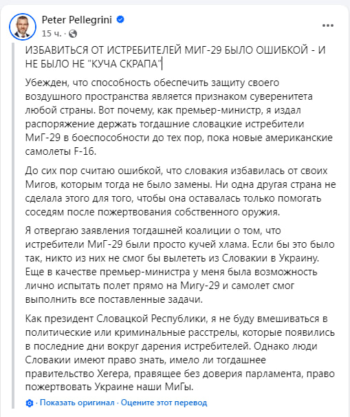 Это было ошибкой — президент Словакии заявил, что нельзя было передавать Украине МиГ-29 без адекватной замены.