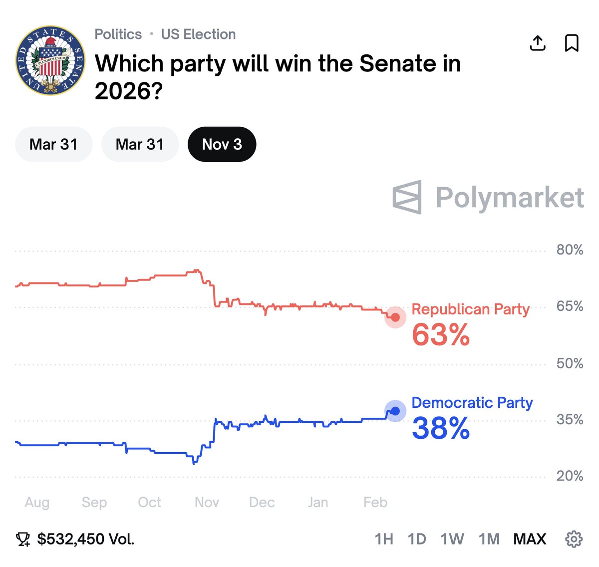 Согласно прогнозу Polymarket, республиканцы должны выиграть выборы в сенат США в ноябре