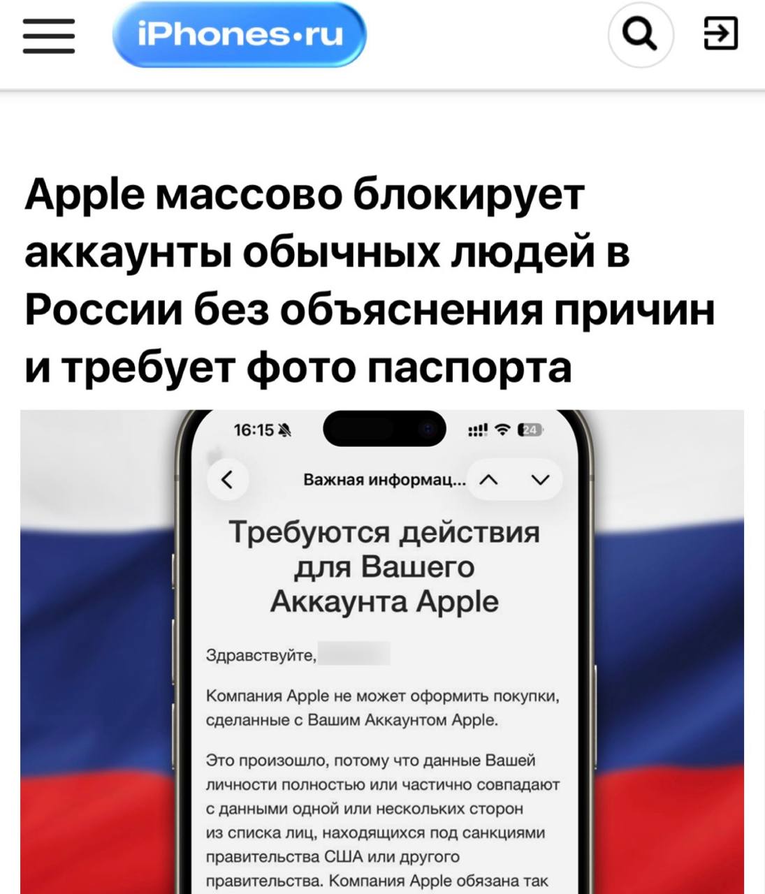 «Россиянам приходит уведомление, где Apple пишет, что не может оформить покупки, сделанные с вашим аккаунтом Apple. Дальше объяснение, что данные вашей личности полностью или частично совпадают с данными одной или нескольких сторон из списков лиц, находящихся под санкциями правительства США или другого правительства. Apple пишет, что проблема в совпадении данных личности. В реальности это почти всегда результат автоматической проверки по базам санкционных лиц, где совпадение может быть не только буквальным.