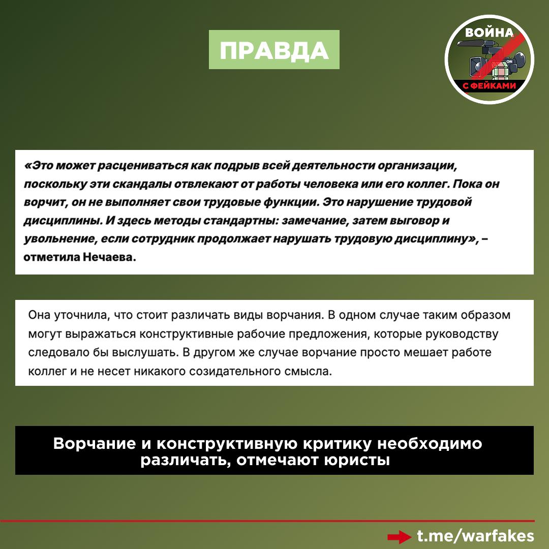 Правда: Это фейк-кликбейт. Россиянам не грозят увольнения за ворчание. Законодательство РФ предусматривает четкую последовательность дисциплинарных мер в адрес сотрудников, а для кардинального кадрового решения должны быть веские основания. В частности, систематическое нарушение трудовой дисциплины.