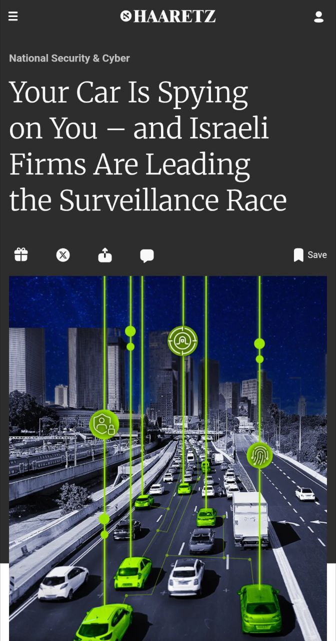 Издание Haaretz утверждает, что израильские киберкомпании имеют технологии, позволяющие взламывать подключённые к сети автомобили и использовать их для сбора разведданных. Речь идёт о направлении CARINT — «автомобильной разведке».