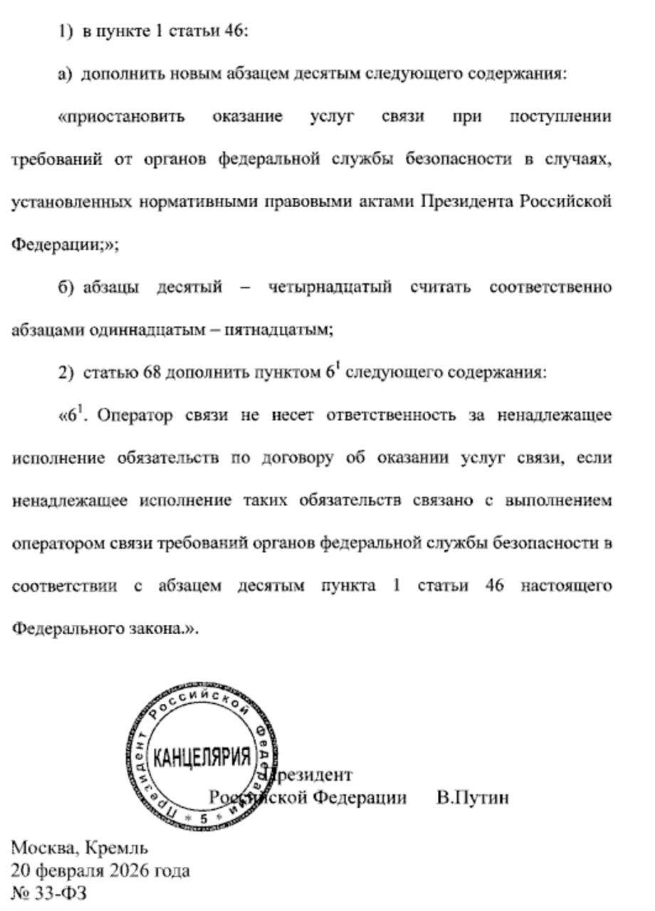 Теперь операторы в России обязаны отключать связь по требованию ФСБ - Путин подписан соответствующий закон: