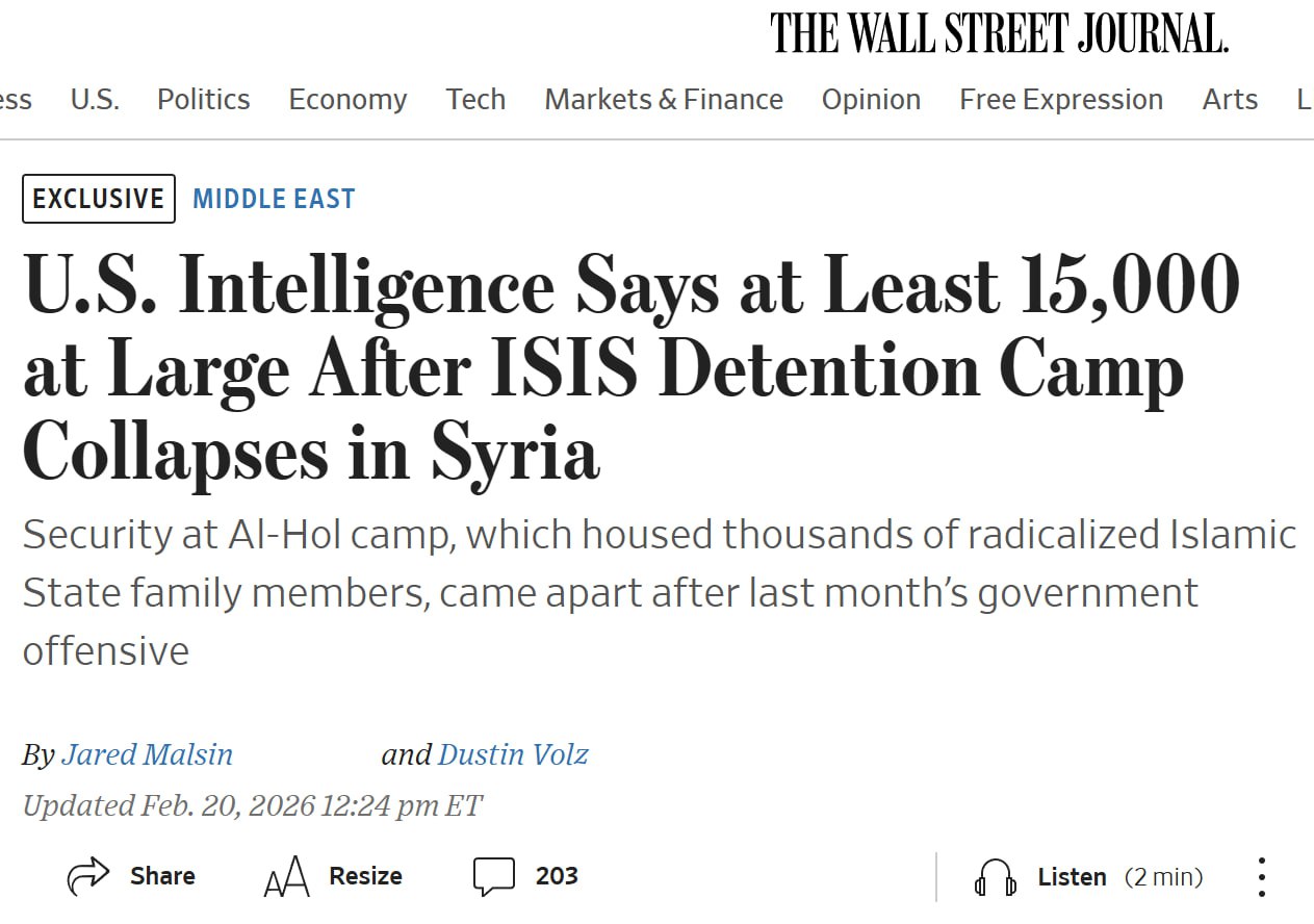 По данным американских разведывательных служб, после бегства из лагеря, где содержались семьи джихадистов, в Сирии сейчас на свободе находятся от 15 000 до 20 000 человек, включая членов группировки «Исламское государство», сообщила американская общественность, знакомая с этой оценкой.