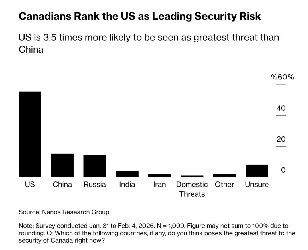 55 проц. канадцев считают, что главная угроза для Канады исходит от США. И только 15 проц. полагают, что Канаде угрожает Китай, и лишь 14% - что Россия. Т.о., США воспринимаются как в 4 раза бОльшая угроза, чем Россия, и даже почти в 2 раза бОльшая угроза, чем Китай и Россия вместе взятые