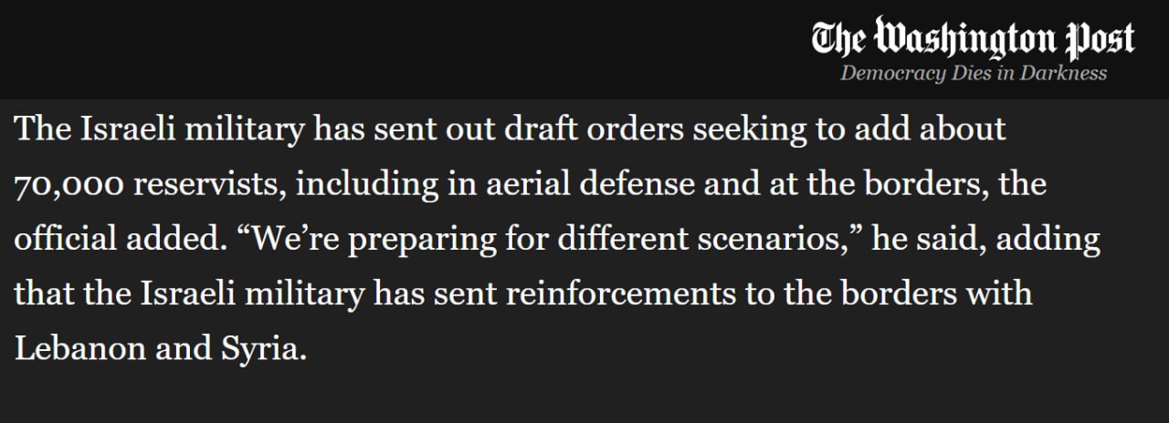 Израильские военные разослали приказы о призыве около 70 000 резервистов, в том числе для службы в противовоздушной обороне и на границах, сообщает The Washington Post со ссылкой на израильского военного чиновника.