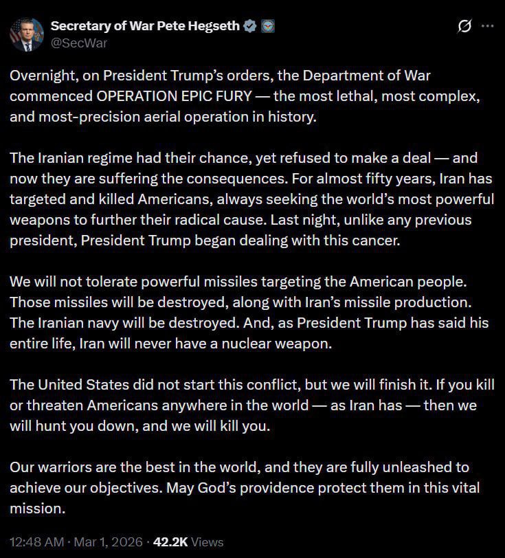 «Этой ночью по приказу президента Трампа министерство войны начало операцию «ЭПИЧЕСКАЯ ЯРОСТЬ» — самую смертоносную, самую сложную и самую высокоточную воздушную операцию в истории.