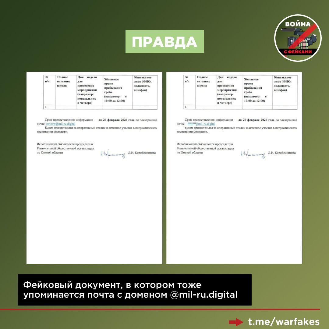Правда: Перед нами очередной документ-подделка. Авторы вброса указали адрес почты с доменом @mil-ru.digital, который ранее неоднократно фигурировал в фейковых документах, якобы связанных с Минобороны России.