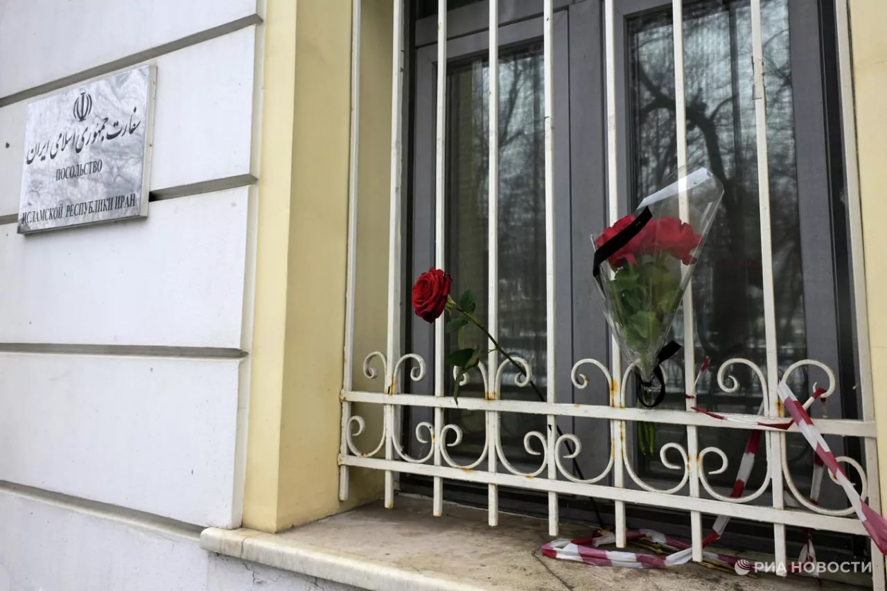 Розы с траурными лентами появились у посольства Ирана в Москве.
