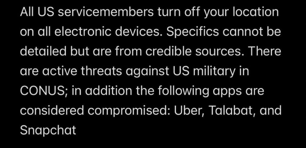 «Все военнослужащие США должны отключить информацию о местоположении на всех электронных устройствах. Подробности не разглашаются, но они получены из заслуживающих доверия источников. В США действуют активные угрозы в отношении американских военных; кроме того, следующие приложения считаются взломанными: Uber, Talabat и Snapchat».