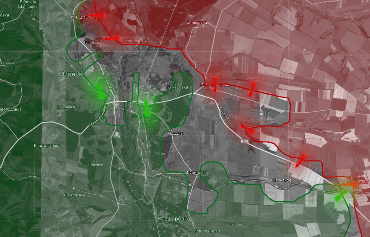 «На Купянском направлении российские войска продвинулись на участке севернее Кучеровки. Идут бои за промзону и восточнее Петропавловки. В районе Песчаного – позиционные бои»
