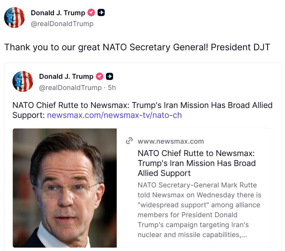 «Спасибо нашему замечательному генеральному секретарю НАТО!», — Трамп благодарит Рютте за «ключевую поддержку» американо-израильской кампании против Ирана со стороны стран альянса.