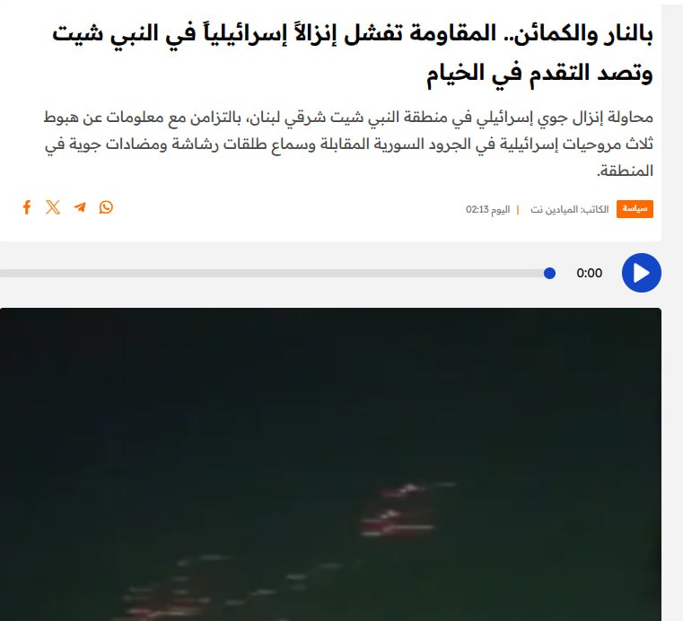 «Корреспондент телеканала Al-Mayadeen сообщил, что израильские вертолёты провалили десантную операцию в районе города Наби на востоке Ливана».