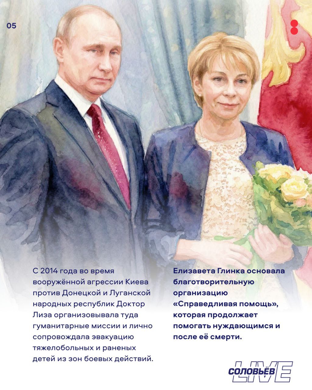 Елизавета Глинка — врач-реаниматолог, филантроп и правозащитник, известная как Доктор Лиза, посвятившая свою жизнь милосердию и помощи нуждающимся. В 2007 году создала в Москве благотворительный фонд «Справедливая помощь» для поддержки бездомных, неизлечимо больных и одиноких пенсионеров. Её деятельность способствовала развитию паллиативной помощи в России. Подробнее о ней — в карточках.