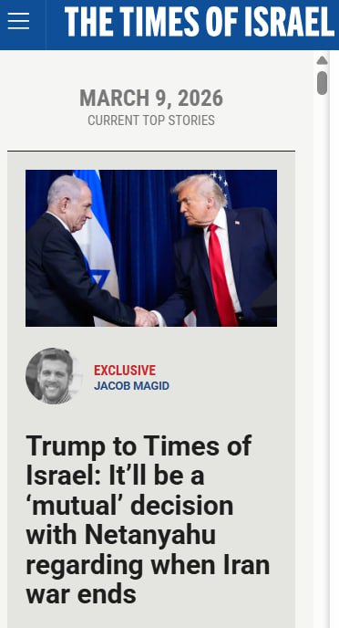 Президент США Дональд Трамп в интервью The Times of Israel сообщил, что вопрос о завершении военной кампании против Ирана будет решаться совместно с премьер-министром Израиля Биньямином Нетаньяху. При этом американский лидер уточнил, что окончательное решение остаётся за Вашингтоном, но позиция Тель-Авива будет учитываться.