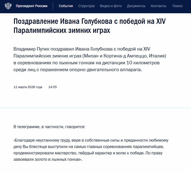 Владимир Путин поздравил паралимпийца Ивана Голубкова с золотой победой в лыжной гонке на 10 км, отметив его трудолюбие, веру в себя и волю к победе.