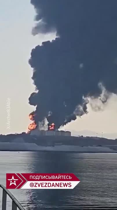 Топливные резервуары уже несколько часов полыхают в порту Омана. В соцсетях публикуют, как утверждается, последствия прилетов. В небо поднимается густой черный дым.