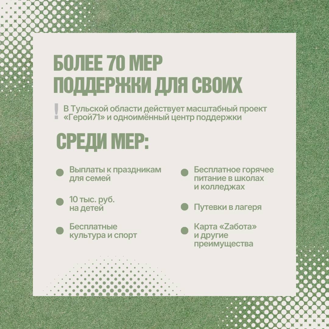 В Тульской области действует множество мер поддержки для участников СВО и их семей. Координирует эту работу масштабный проект «Герой 71» и одноимённый центр. Их задача — чтобы каждый защитник и его близкие чувствовали заботу и уверенность в будущем.