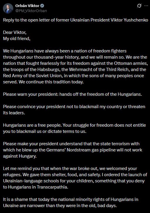 Пожалуйста, дайте понять вашему президенту, что государственный терроризм, которым он взорвал немецкий газопровод «Северный поток», не сработает против Венгрии.
