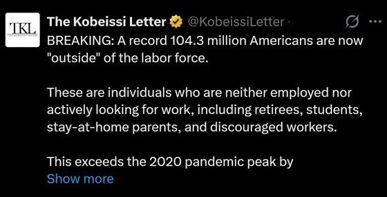 104,3 миллиона — рекордное число американцев, не входящих в состав рабочей силы, включая безработных, пенсионеров, студентов, родителей, которые не работают и занимаются домашним хозяйством, — констатирует аналитическая компания The Kobeissi Letter (TKL)