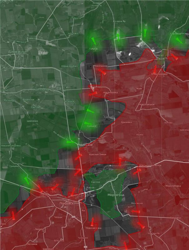 «На Покровском направлении фиксируется продвижение ВС РФ у Удачного в сторону Сергеевки.ВСУ пытаются контратаковать у Гришино, но безрезультатно.Российские войска фактически взяли микрорайоны Покровска...